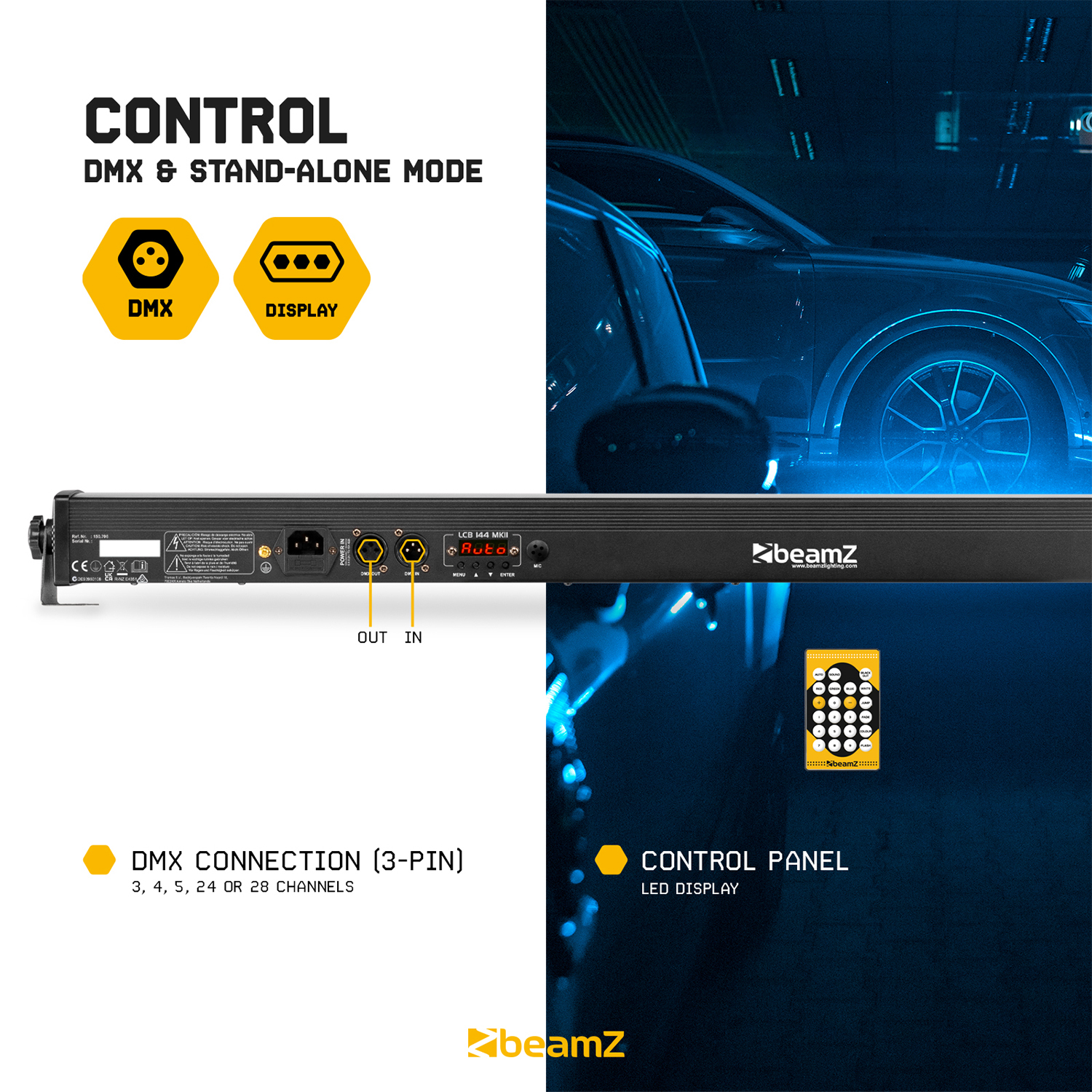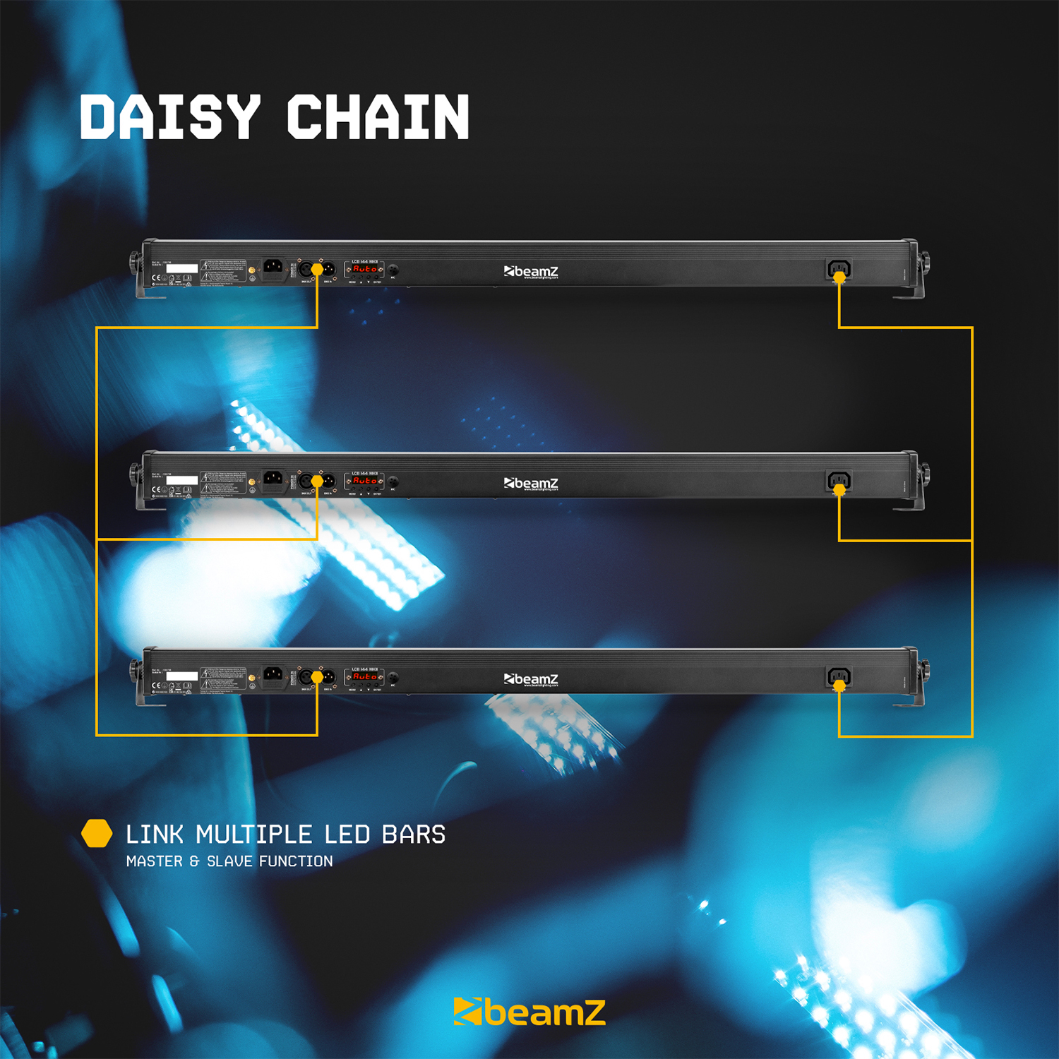 It features 144 SMD RGB LEDs, allowing for extensive colour mixing to create a wide range of hues. This powerful light bar system is ideal for matching the lighting to specific themes or moods at events, with easy daisy-chain operation of up to six LCB144 units, independent of a DMX setup.