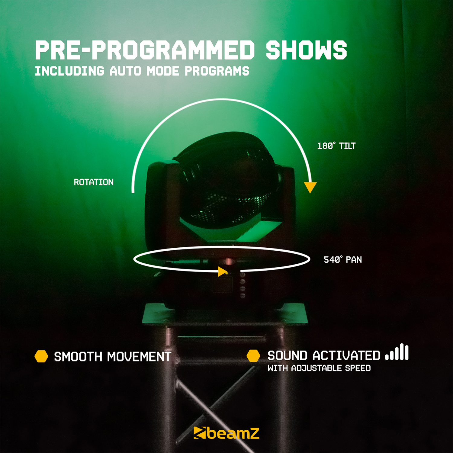 Tailor the lighting effects of this moving head with an external DMX controller, ideal for professional setups.