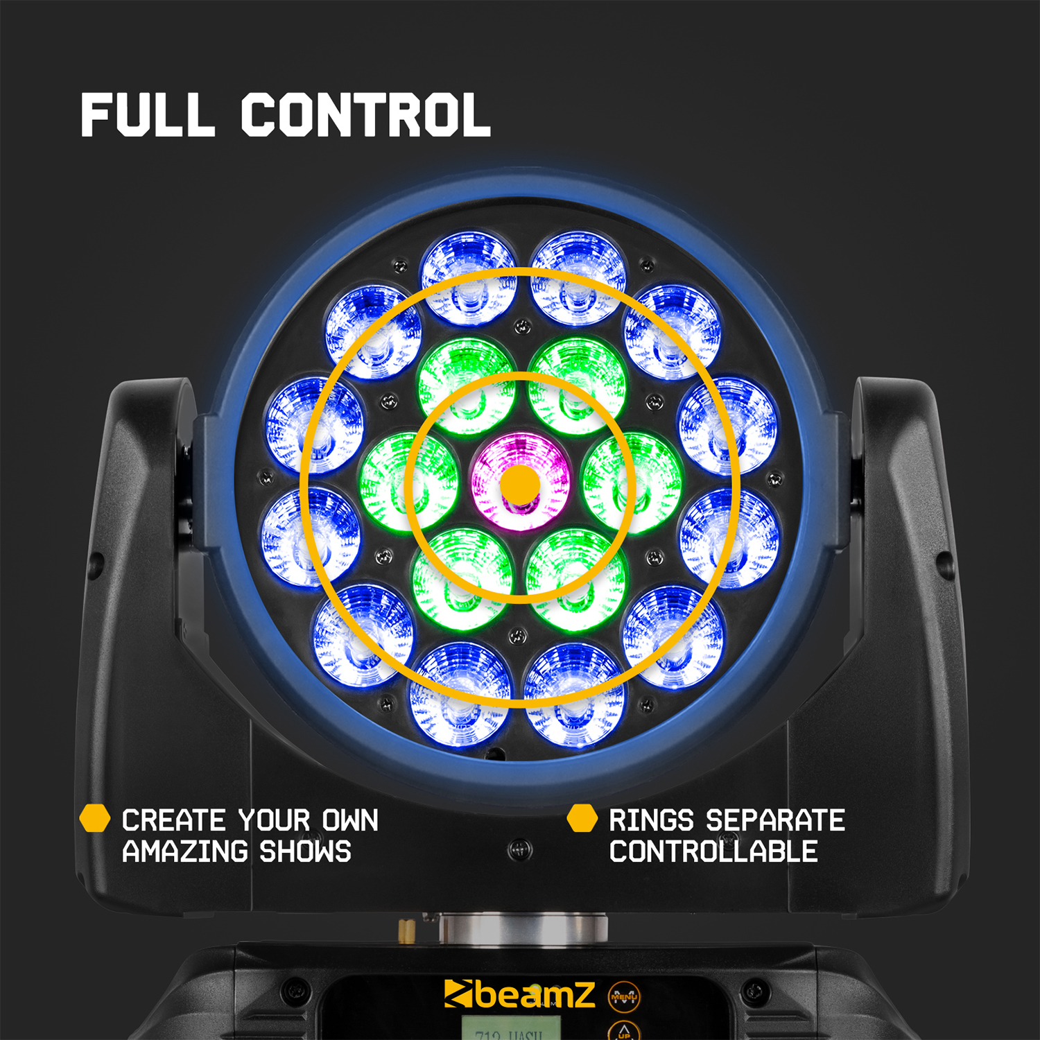 Illuminate stages, nightclubs, and event spaces with the BeamZ Fuze1910 Moving Head Wash Light. This high-quality, professional moving headlight is designed to enhance any performance or event. It features nineteen 10W LEDs, equipped with RGBW colour blending technology and divided into three separately controllable rings, delivering a variety of vivid and dynamic colour washes.